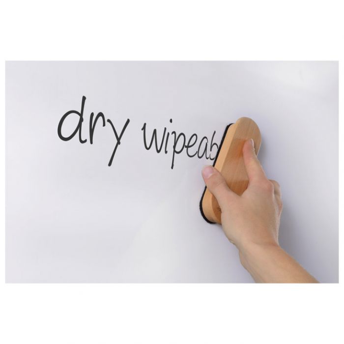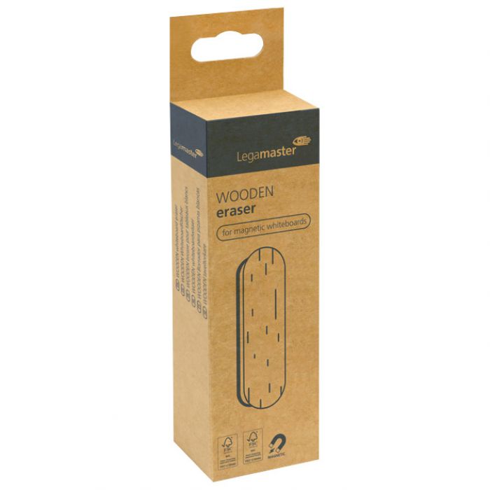 Drveni magnetski brisač s izmjenjivim jastučićem; dimenzije: D 15 x Š 4,5 x V 3 cm; izrađen od bukovog drva "fagus sylvatica" s lakiranim premazom; može se koristiti na bijelim pločama Legamaster; svaki predmet je jedinstven po boji i izgledu jer je izrađen od prirodnog drva; samo za suhu upotrebu
