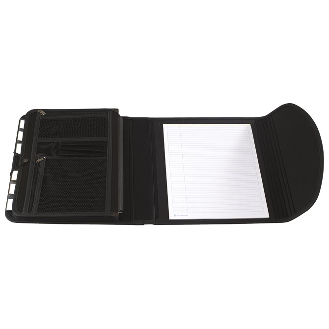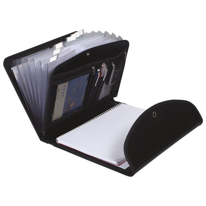 format: A4; dimenzija: 255x335 mm; reciklirani PP; sadrži: mjesto za 3 olovke, blok kolegij sa crtama, 6 pp pregrada koje se zatvaraju sa gumicom, 2 džepa sa zipom, 1 pretinac; zatvaranje na gumb
