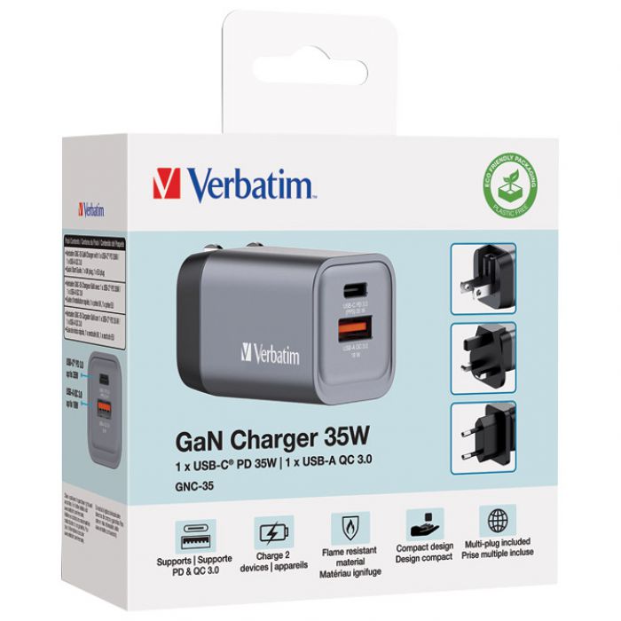 PUNJAČ PUTNI ZA MOBITELE I TABLETE GAN 1XUSB-C/PD 35W/1XUSB-A QC 3.0 (EU/UK/US) VERBATIM 32200