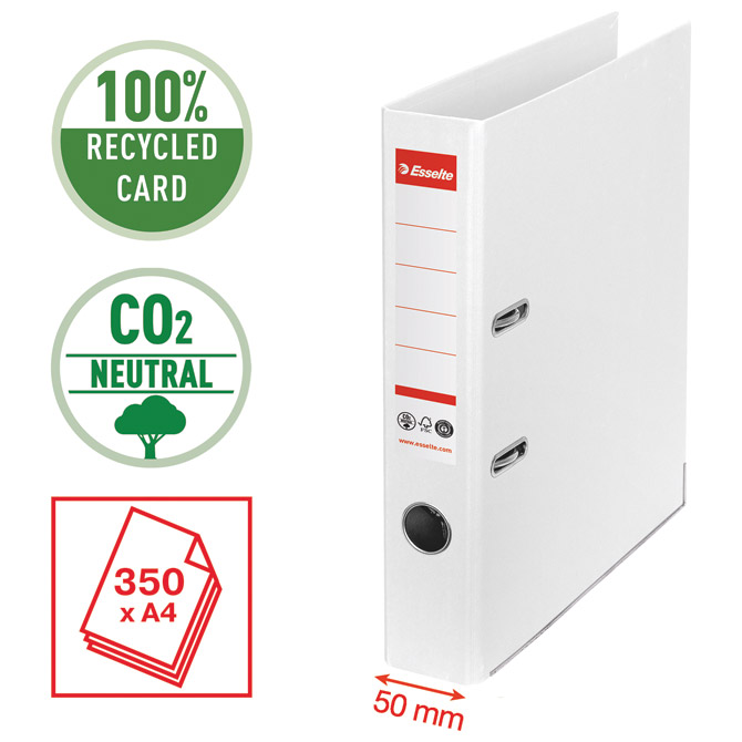 format: A4; kapacitet: 350 listova 80 gramskog papira; hrbat sa samoljepljivom etiketom; izrađen od 100% recikliranog kartona te je 100% reciklirajući (CO2 neutral - bez emisije CO2 - nema utjecaja na klimu); metalna šina na donjim rubovima, bočno zatvaranje i rupa za prst na hrptu za jednostavno rukovanje i sigurno skladištenje dokumenata; patentirani mehanizam s izvanrednom silom za dosljedno precizno zatvaranje; zajamčeno pouzdano zatvaranje čak i nakon 10 000 korištenja (3 godine garanicije na mehanizam s GS i LGA certifikatom); ekološki certifikati: Climate Neutral, FSC i Blue Angel; proizveden u Europi