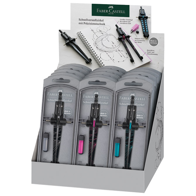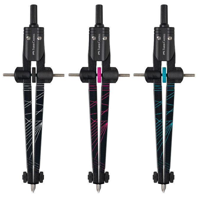 s preciznim podešavanjem; najveći promjer kružnice 340 mm; sadrži i tubu mina; 3 boje: crna/roza, crna/srebrna i crna/tirkizna; PVC kutija; blister