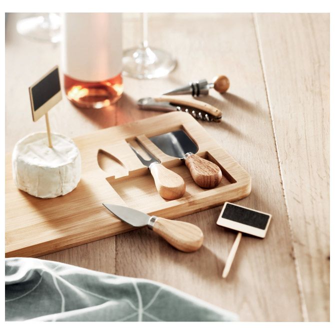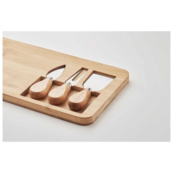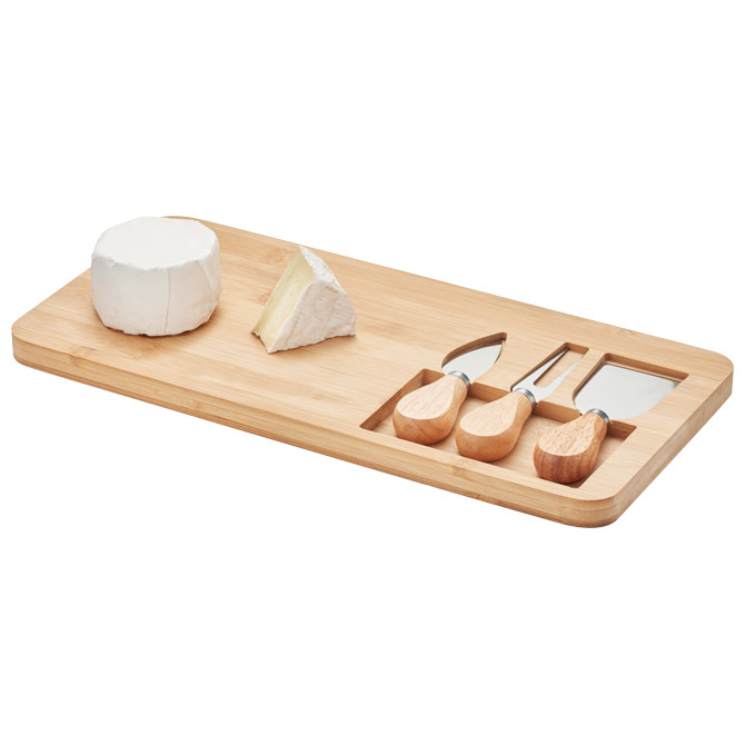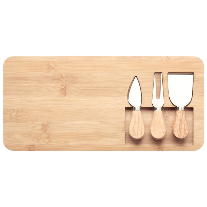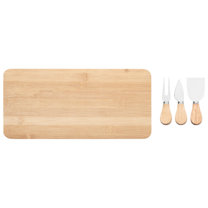 izrađen od bambusa; sadrži 4 dijela: 2 noža za serviranje, vilica i daska za rezanje; dimenzija: 37,5x17,5x1,5 cm