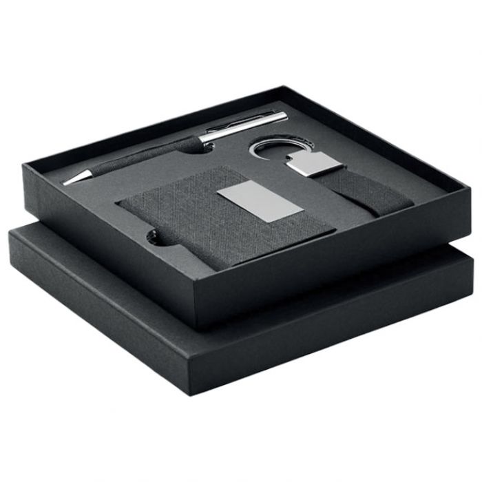 Poklon set od 3 dijela u poklon kutiji. Uključuje metalnu kemijsku olovku s RPET poliester detaljima, privjesak za ključeve od RPET poliestera i futrolu za kartice od RPET poliestera s metalnom pločicom. Dim:16x16x2,7cm