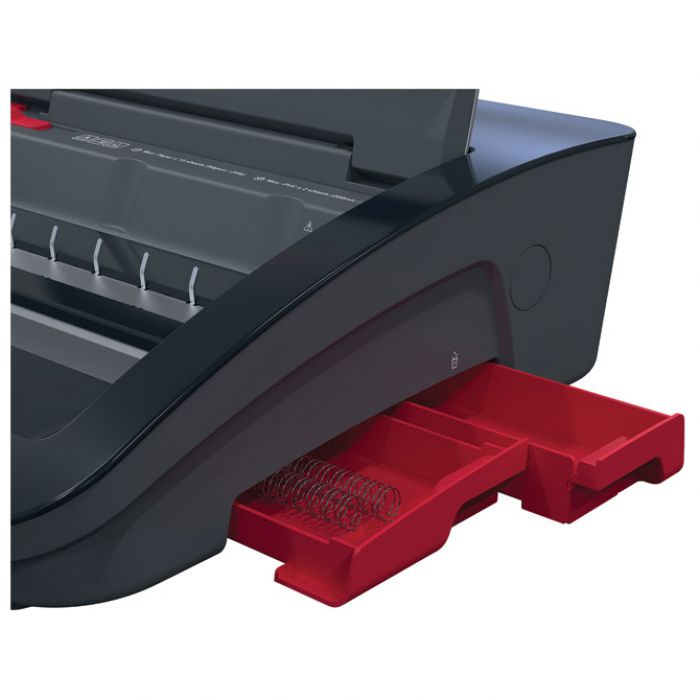 format: A4/A5; buši do 12 listova 80 gramskog papira; ručna bušilica s jednom ručkom; kapacitet; 19/165 listova; može uvezivati do 165 listova odjednom koristeći plastične spirale promjera 19 mm; zahvaljujući svom laganom i prostorno učinkovitom dizajnu, može se koristiti bilo gdje i bilo kada te se lako posprema kada nije u upotrebi; uključuje ladicu za ostatke papira radi lakšeg odlaganja te praktičan pretinac za odlaganje pribora; dimenzije 458x295x264; garancija na stroj 2 godine