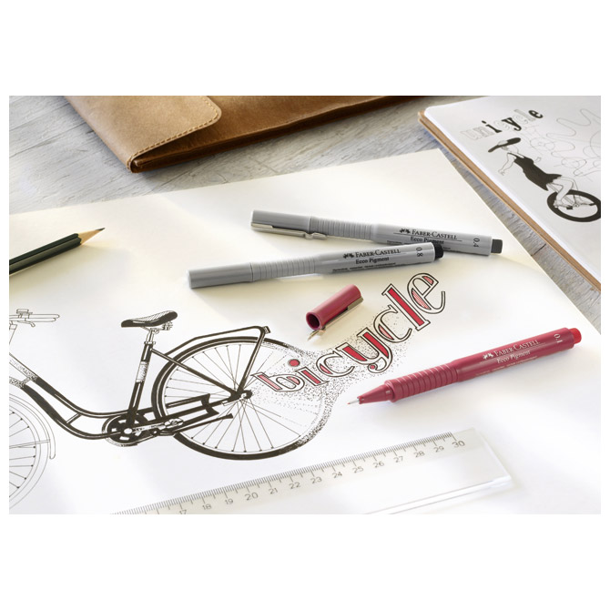 ima dolg kovinsko ojačan vrh; ergonomski oprijem; kovinska sponka; pigmentno črnilo je trajno in odporno na svetlobo; brez kislin; rezervoar in pokrovček flomastra sta iz recikliranega materiala; idealen za risanje, skiciranje in pisanje