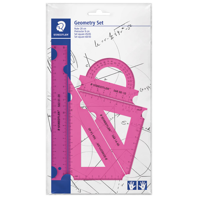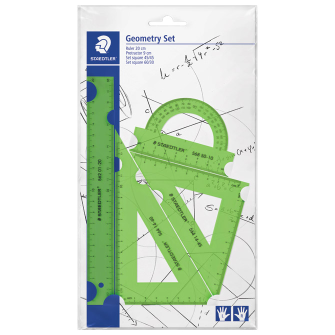 vsebuje: ravnilo 20 cm (z mersko skalo za levičarje in desničarje), trikotniki (raznostrani in enakokraki) ter kotomer 180°; PVC; blister