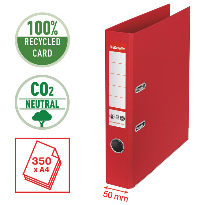 format: A4; kapaciteta: 350 listov 80-gramskega papirja; hrbtišče s samolepilno etiketo; izdelano iz 100% recikliranega kartona in je 100% reciklabilno (CO2 nevtralno - brez emisij CO2 - brez vpliva na podnebje); kovinska tirnica na spodnjih robovih, stranski zapiralni mehanizem in luknja za prst na hrbtišču za enostavno rokovanje in varno shranjevanje dokumentov; patentiran mehanizem z odličnim pritiskom za dosledno natančno zapiranje; garantirano zanesljivo zapiranje tudi po 10.000 upotrebi (3 leta garancije na mehanizem s certifikatom GS in LGA); okoljski certifikati: Climate Neutral, FSC in Blue Angel; proizvedeno v Evropi