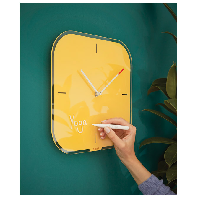 dimenzija: 30x30x4 cm; tihi kvarčni urni mehanizem je idealen za pisarne, prostore za branje in spalnice, saj vas ne moti zvok tiktakanja ure; narejen iz kaljenega varnostnega stekla debeline 4 mm z visoko odpornostjo na praske in udrtine; vrh minutnega kazalca je rdeče barve; idealen za dom in pisarno; lahko ga kombiniramo z ostalimi Leitzovimi izdelki iz Cozy linije za udobje in slog ob vrhunski kakovosti, idealno za produktivno delovno okolje; priložen je en marker za pisanje lastnih številk ali opomb na stekleni uri z brisalcem na pokrovčku; 1 AA baterija (ni vključena); v kartonski škatli