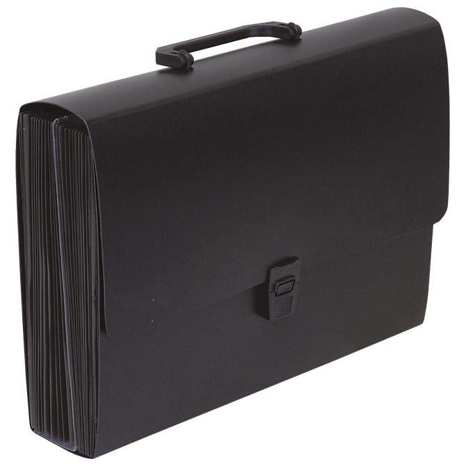 format: A4; dimenzija: 330x240x75 mm; PP; ima 26 prozornih PP pregrad; z ročajem in sponko za zapiranje