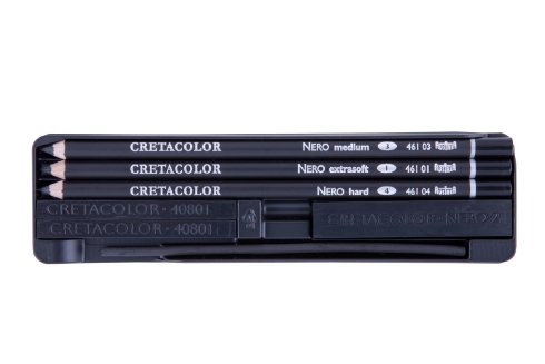 Vsebina: Svinčniki za umetnike (Nero ekstra mehki, srednji, trdi), Nero palčka (debela) 7 x 14 mm, Nero palčke 7 x 7 mm, Naravno oglje Ø 4 mm.